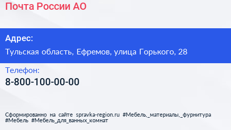 Почта России, АО по адресу Тульская область, Ефремов, улица Горького, 28 в дальнейшем Организация, размещена в следующих категориях: