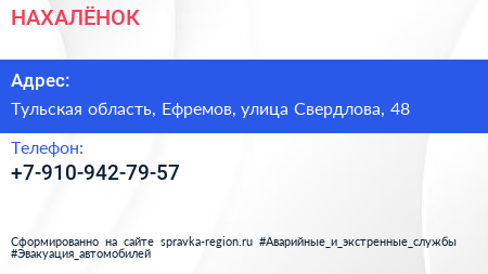 НАХАЛЁНОК по адресу Тульская область, Ефремов, улица Свердлова, 48 в дальнейшем Организация, размещена в следующих категориях: