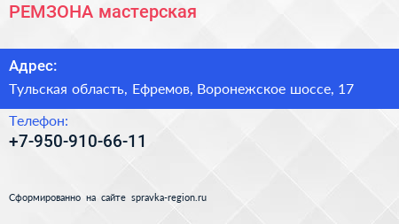 РЕМЗОНА, мастерская по адресу Тульская область, Ефремов, Воронежское шоссе, 17 в дальнейшем Организация, размещена в следующих категориях: