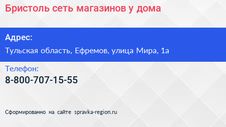 Бристоль, сеть магазинов у дома по адресу Тульская область, Ефремов, улица Мира, 1а в дальнейшем Организация, размещена в следующих категориях: