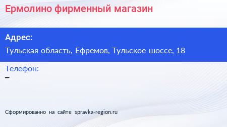 Ермолино, фирменный магазин по адресу Тульская область, Ефремов, Тульское шоссе, 18 в дальнейшем Организация, размещена в следующих категориях: