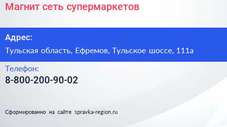 Магнит, сеть супермаркетов по адресу Тульская область, Ефремов, Тульское шоссе, 111а в дальнейшем Организация, размещена в следующих категориях: