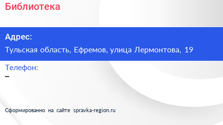 Библиотека по адресу Тульская область, Ефремов, улица Лермонтова, 19 в дальнейшем Организация, размещена в следующих категориях: