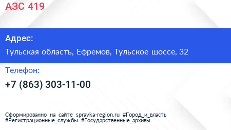 АЗС №419 по адресу Тульская область, Ефремов, Тульское шоссе, 32 в дальнейшем Организация, размещена в следующих категориях: