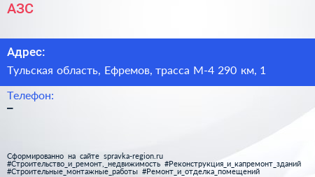 АЗС по адресу Тульская область, Ефремов, трасса М-4 290 км, 1 в дальнейшем Организация, размещена в следующих категориях: