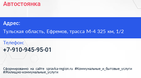 Автостоянка по адресу Тульская область, Ефремов, трасса М-4 325 км, 1/2 в дальнейшем Организация, размещена в следующих категориях: