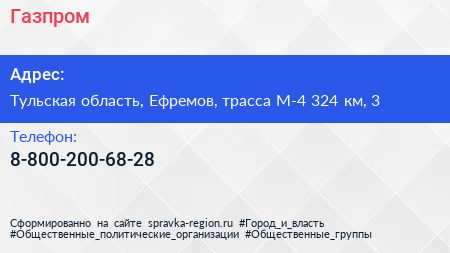 Газпром по адресу Тульская область, Ефремов, трасса М-4 324 км, 3 в дальнейшем Организация, размещена в следующих категориях: