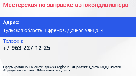 Мастерская по заправке автокондиционера по адресу Тульская область, Ефремов, Дачная улица, 4 в дальнейшем Организация, размещена в следующих категориях: