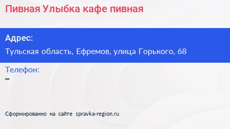 Пивная Улыбка, кафе-пивная по адресу Тульская область, Ефремов, улица Горького, 68 в дальнейшем Организация, размещена в следующих категориях: