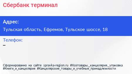 Сбербанк, терминал по адресу Тульская область, Ефремов, Тульское шоссе, 18 в дальнейшем Организация, размещена в следующих категориях: