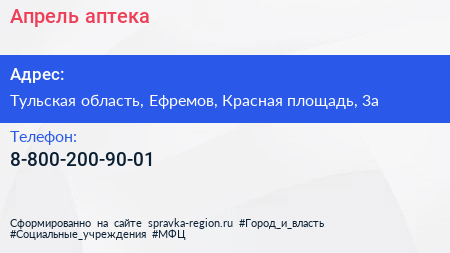 Апрель, аптека по адресу Тульская область, Ефремов, Красная площадь, 3а в дальнейшем Организация, размещена в следующих категориях: