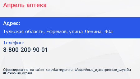 Апрель, аптека по адресу Тульская область, Ефремов, улица Ленина, 40а в дальнейшем Организация, размещена в следующих категориях: