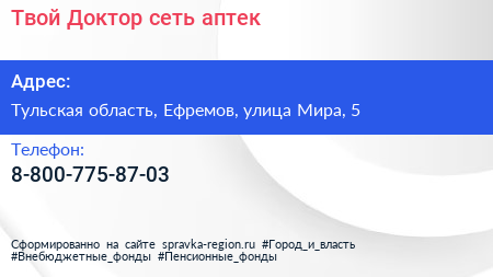 Твой Доктор, сеть аптек по адресу Тульская область, Ефремов, улица Мира, 5 в дальнейшем Организация, размещена в следующих категориях: