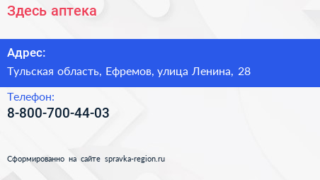 Здесь аптека по адресу Тульская область, Ефремов, улица Ленина, 28 в дальнейшем Организация, размещена в следующих категориях: