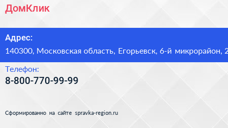 ДомКлик по адресу 140300, Московская область, Егорьевск, 6-й микрорайон, 2 в дальнейшем Организация, размещена в следующих категориях: