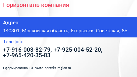 Горизонталь, компания по адресу 140301, Московская область, Егорьевск, Советская, 86 в дальнейшем Организация, размещена в следующих категориях:
