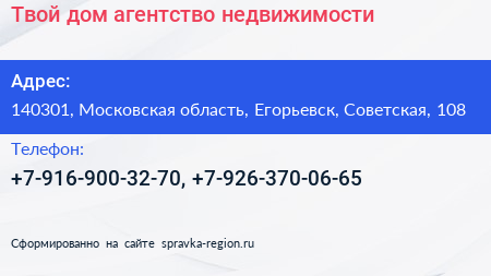 Твой дом, агентство недвижимости по адресу 140301, Московская область, Егорьевск, Советская, 108 в дальнейшем Организация, размещена в следующих категориях: