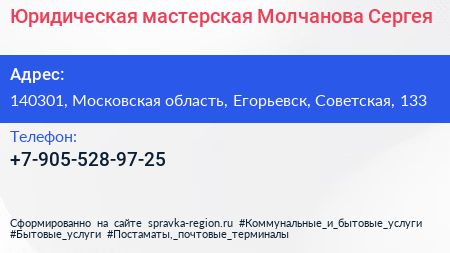 Юридическая мастерская Молчанова Сергея по адресу 140301, Московская область, Егорьевск, Советская, 133 в дальнейшем Организация, размещена в следующих категориях: