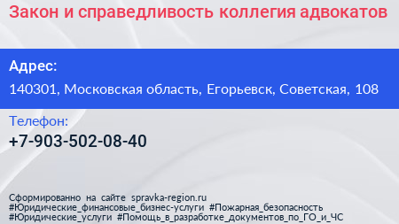 Закон и справедливость, коллегия адвокатов по адресу 140301, Московская область, Егорьевск, Советская, 108 в дальнейшем Организация, размещена в следующих категориях: