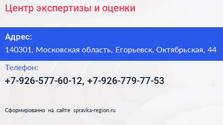 Центр экспертизы и оценки по адресу 140301, Московская область, Егорьевск, Октябрьская, 44 в дальнейшем Организация, размещена в следующих категориях:
