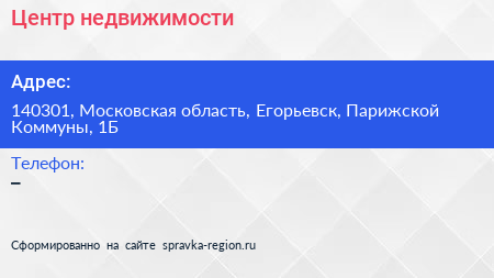 Центр недвижимости по адресу 140301, Московская область, Егорьевск, Парижской Коммуны, 1Б в дальнейшем Организация, размещена в следующих категориях: