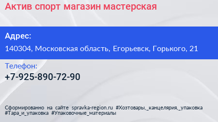 Актив спорт, магазин-мастерская по адресу 140304, Московская область, Егорьевск, Горького, 21 в дальнейшем Организация, размещена в следующих категориях: