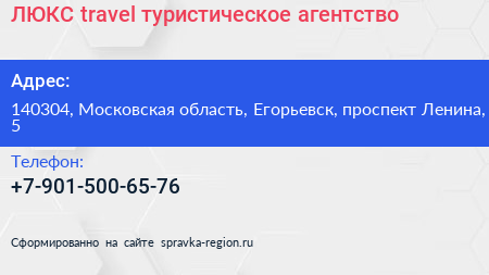 ЛЮКС travel, туристическое агентство по адресу 140304, Московская область, Егорьевск, проспект Ленина, 5 в дальнейшем Организация, размещена в следующих категориях: