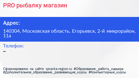 PRO рыбалку, магазин по адресу 140304, Московская область, Егорьевск, 2-й микрорайон, 11а в дальнейшем Организация, размещена в следующих категориях: