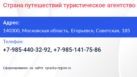 Страна путешествий, туристическое агентство по адресу 140300, Московская область, Егорьевск, Советская, 185 в дальнейшем Организация, размещена в следующих категориях: