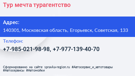 Тур-мечта, турагентство по адресу 140301, Московская область, Егорьевск, Советская, 133 в дальнейшем Организация, размещена в следующих категориях: