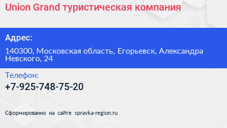 Union Grand, туристическая компания по адресу 140300, Московская область, Егорьевск, Александра Невского, 24 в дальнейшем Организация, размещена в следующих категориях: