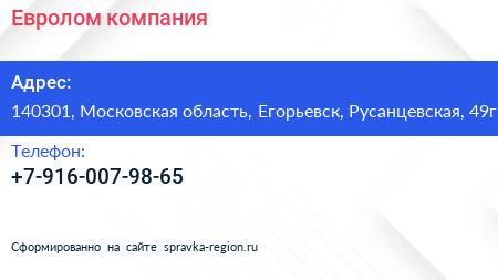 Евролом, компания по адресу 140301, Московская область, Егорьевск, Русанцевская, 49г в дальнейшем Организация, размещена в следующих категориях:
