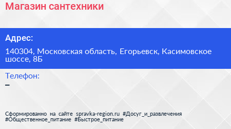 Магазин сантехники по адресу 140304, Московская область, Егорьевск, Касимовское шоссе, 8Б в дальнейшем Организация, размещена в следующих категориях: