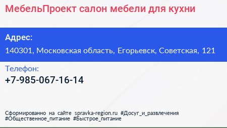 МебельПроект, салон мебели для кухни по адресу 140301, Московская область, Егорьевск, Советская, 121 в дальнейшем Организация, размещена в следующих категориях: