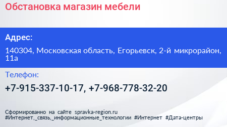 Обстановка, магазин мебели по адресу 140304, Московская область, Егорьевск, 2-й микрорайон, 11а в дальнейшем Организация, размещена в следующих категориях: