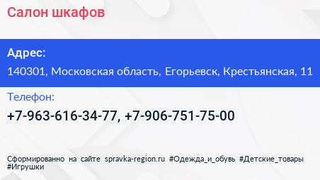 Салон шкафов по адресу 140301, Московская область, Егорьевск, Крестьянская, 11 в дальнейшем Организация, размещена в следующих категориях: