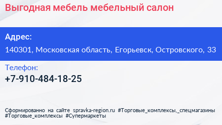 Выгодная мебель, мебельный салон по адресу 140301, Московская область, Егорьевск, Островского, 33 в дальнейшем Организация, размещена в следующих категориях: