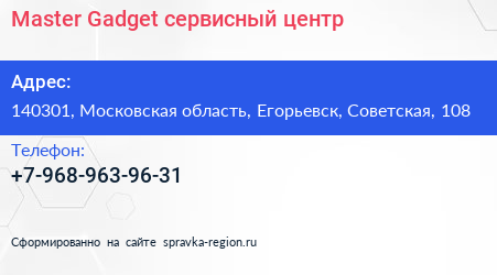 Master Gadget, сервисный центр по адресу 140301, Московская область, Егорьевск, Советская, 108 в дальнейшем Организация, размещена в следующих категориях: