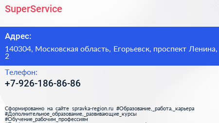 SuperService по адресу 140304, Московская область, Егорьевск, проспект Ленина, 2 в дальнейшем Организация, размещена в следующих категориях: