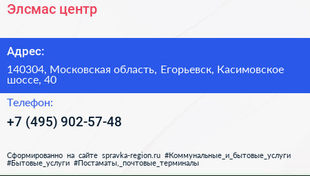 Элсмас-центр+ по адресу 140304, Московская область, Егорьевск, Касимовское шоссе, 40 в дальнейшем Организация, размещена в следующих категориях: