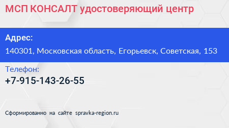 МСП КОНСАЛТ, удостоверяющий центр по адресу 140301, Московская область, Егорьевск, Советская, 153 в дальнейшем Организация, размещена в следующих категориях: