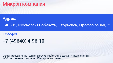 Микрон, компания по адресу 140301, Московская область, Егорьевск, Профсоюзная, 25 в дальнейшем Организация, размещена в следующих категориях: