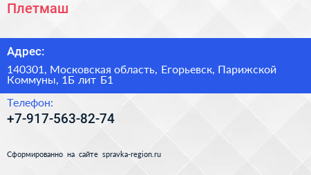 Плетмаш по адресу 140301, Московская область, Егорьевск, Парижской Коммуны, 1Б лит Б1 в дальнейшем Организация, размещена в следующих категориях: