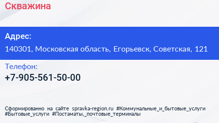 Скважина+ по адресу 140301, Московская область, Егорьевск, Советская, 121 в дальнейшем Организация, размещена в следующих категориях: