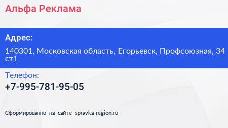 Альфа Реклама по адресу 140301, Московская область, Егорьевск, Профсоюзная, 34 ст1 в дальнейшем Организация, размещена в следующих категориях: