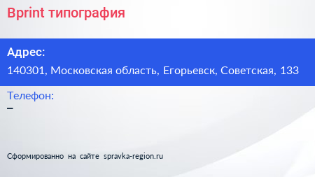 Bprint, типография по адресу 140301, Московская область, Егорьевск, Советская, 133 в дальнейшем Организация, размещена в следующих категориях: