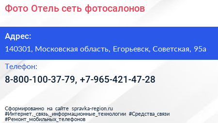 Фото Отель, сеть фотосалонов по адресу 140301, Московская область, Егорьевск, Советская, 95а в дальнейшем Организация, размещена в следующих категориях: