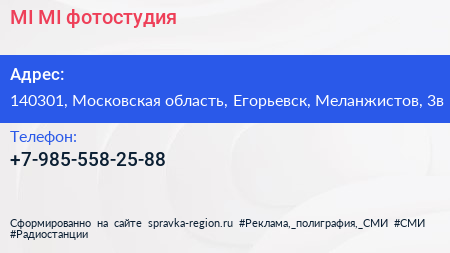 MI & MI, фотостудия по адресу 140301, Московская область, Егорьевск, Меланжистов, 3в в дальнейшем Организация, размещена в следующих категориях: