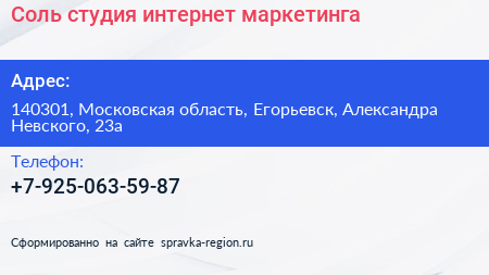 Соль, студия интернет-маркетинга по адресу 140301, Московская область, Егорьевск, Александра Невского, 23а в дальнейшем Организация, размещена в следующих категориях: