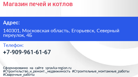 Магазин печей и котлов по адресу 140301, Московская область, Егорьевск, Северный переулок, 4Б в дальнейшем Организация, размещена в следующих категориях: